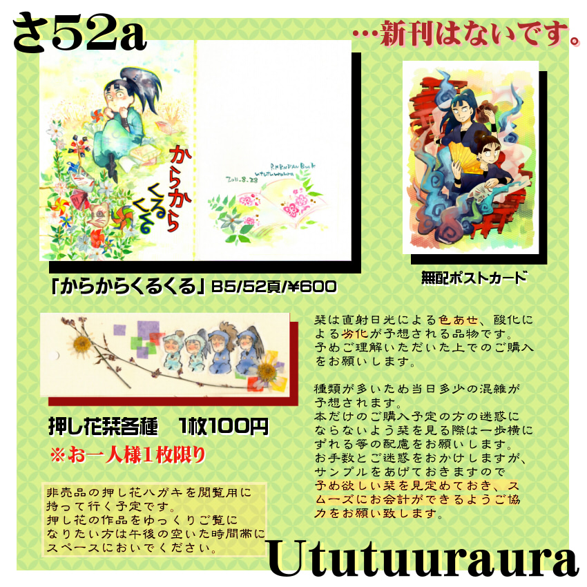 新刊はないので、先日予告したとおりペーパーと無配ポストカード、それから押し花の栞を持っていきます。机の上に関しては以下の画像のとおりです。栞のサンプルはオフラインのリンク(下の方にあります)もしくは、イラストとして更新してありますので、そちらを参照してください。
